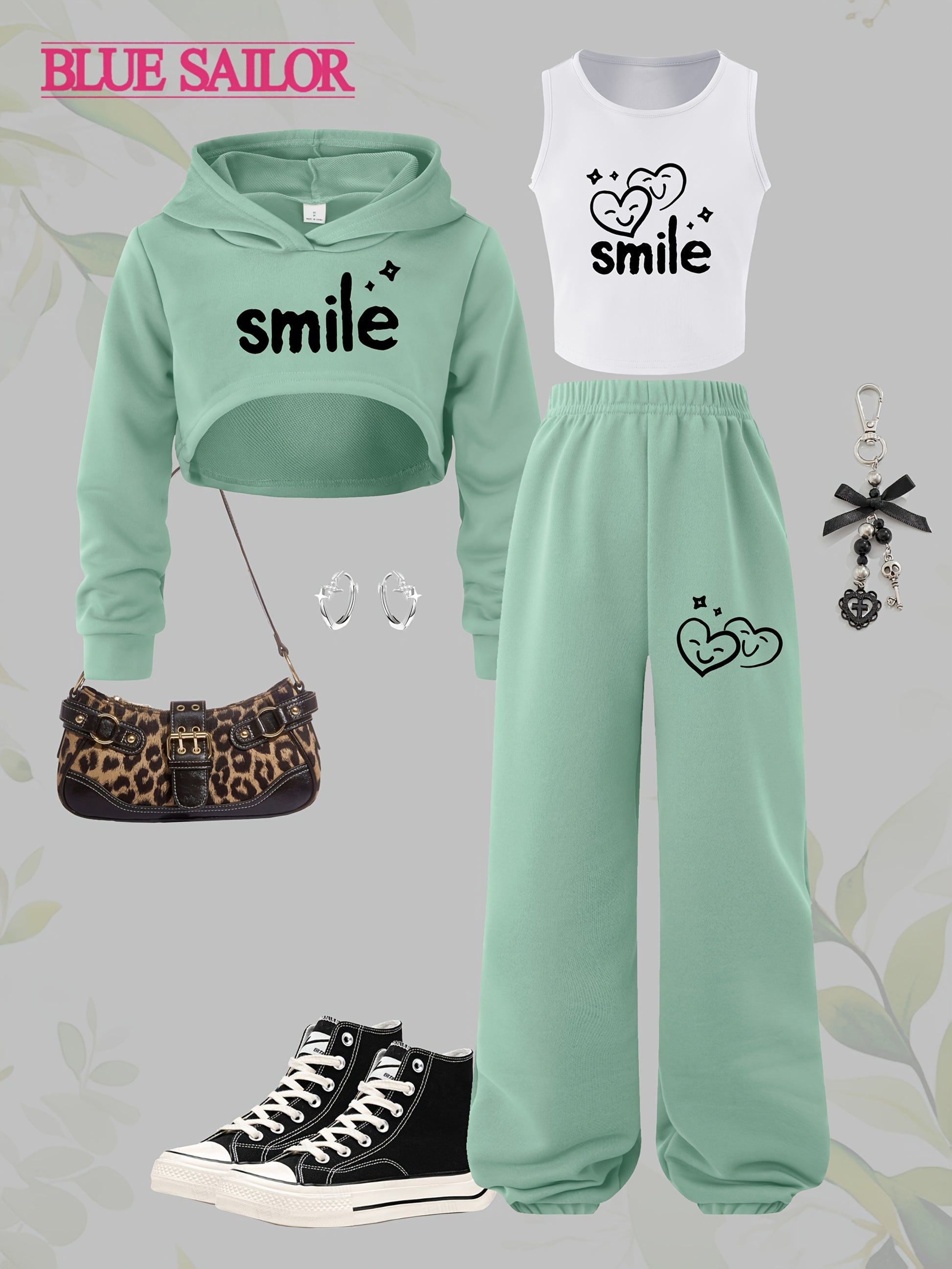 3pcs Girls' Long-Sleeve Hooded Crop Top and Pants Casual Sporty Outdoor 3pcs Set, Perfect for Outdoor