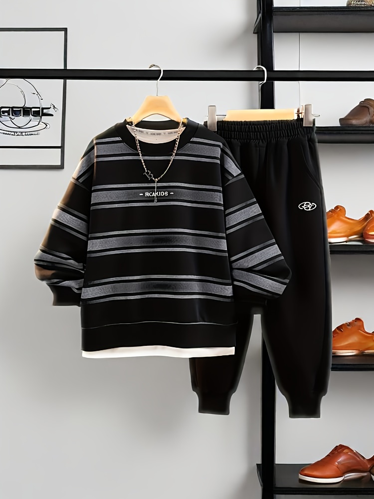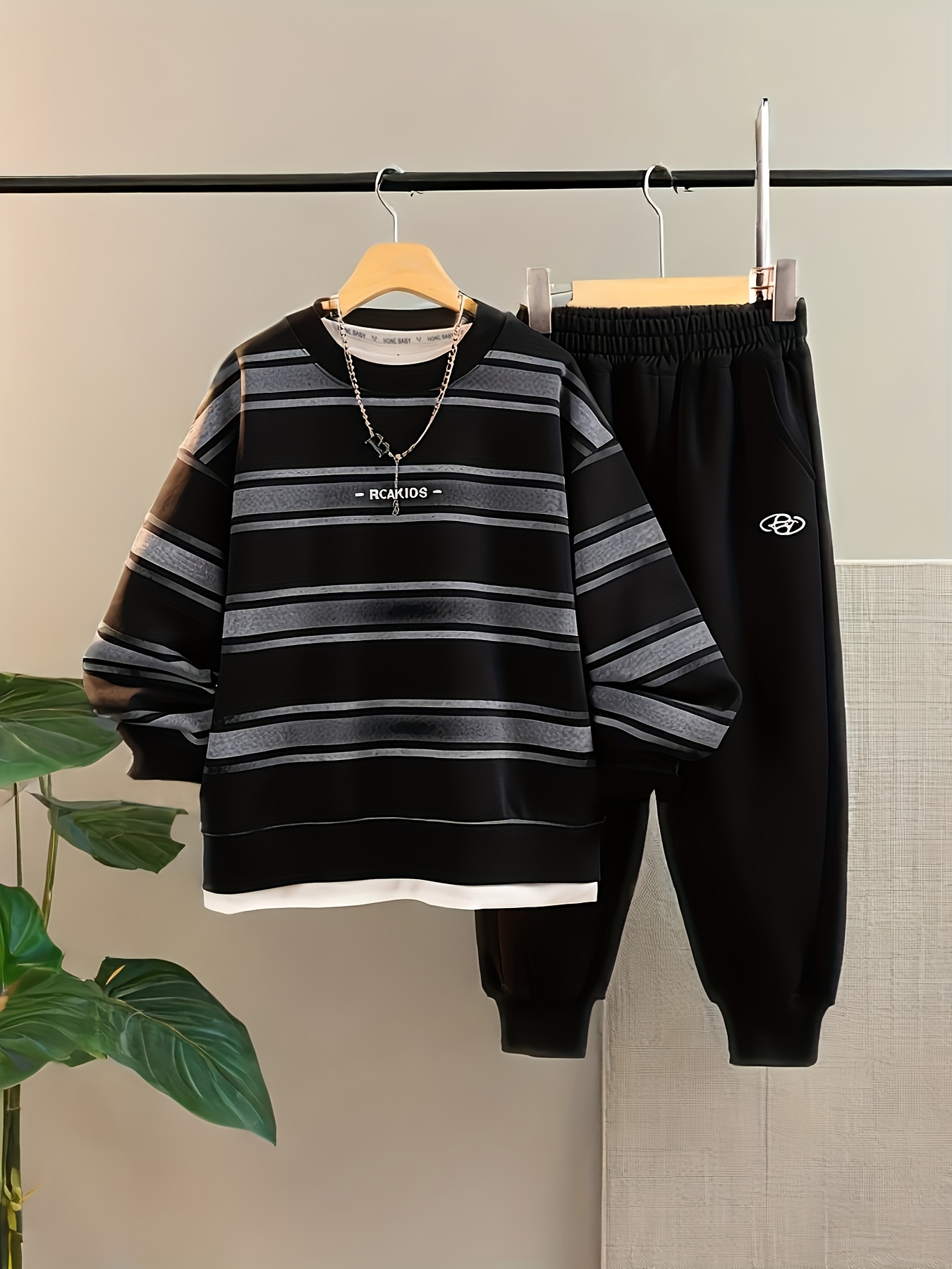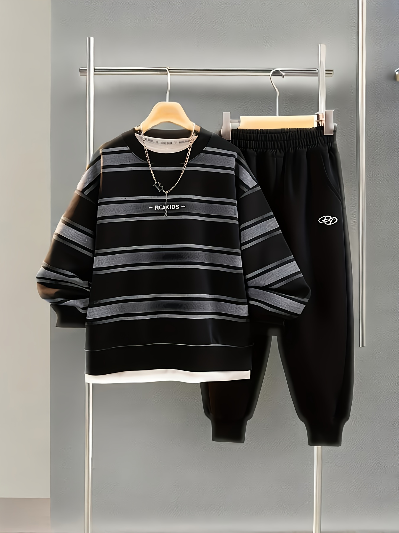 Boys' Autumn 2025 New Style Outfit Featuring a Round Neck Sweatshirt And Pants, Designed to Look Like a Two-Piece Set with Trendy Striped Prints, for Outdoor
