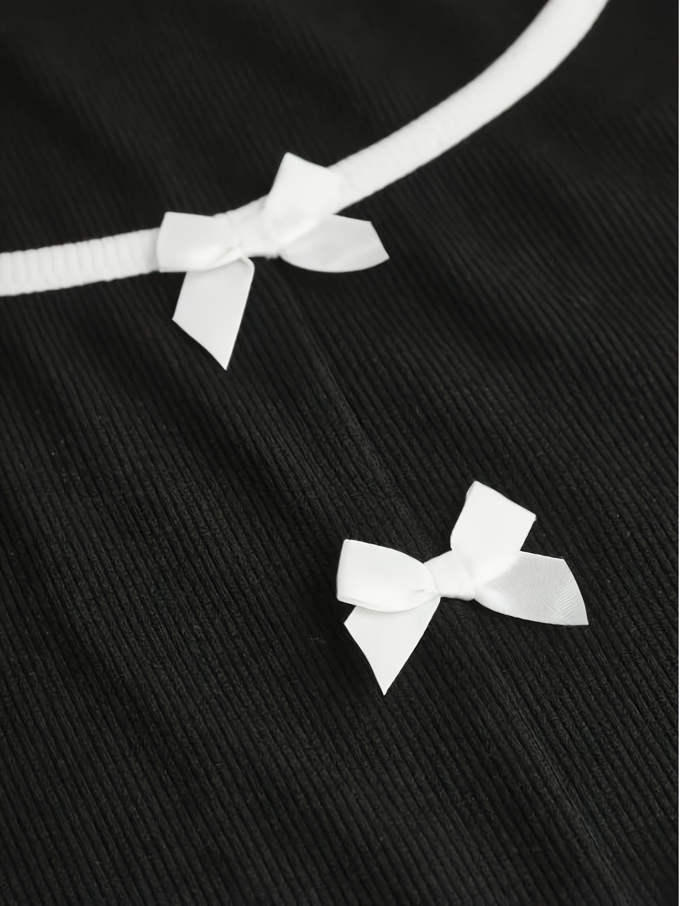 Spring and Autumn Girls' Comfortable Simple Fashion Black Short Sleeve Top with Black Bow Flare Pants Set, Suitable for Outdoor Leisure and Party Activities, Perfect for Outdoor