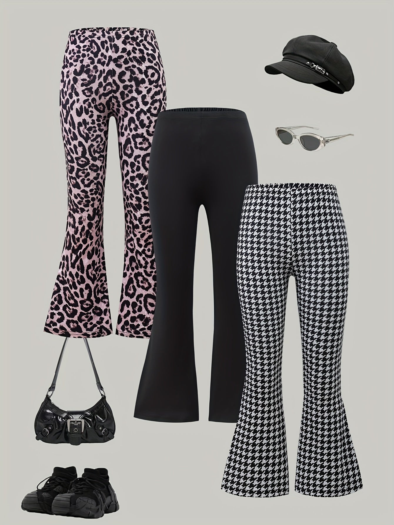 [Stylish Girls' Flare Leg Pants] 3pcs Set of Stylish Girls' Flare Leg Pants - Comfortable Elastic Leopard & Houndstooth & Black, Suitable for Spring Summer Autumn, Ages 3+, Perfect for Outdoor