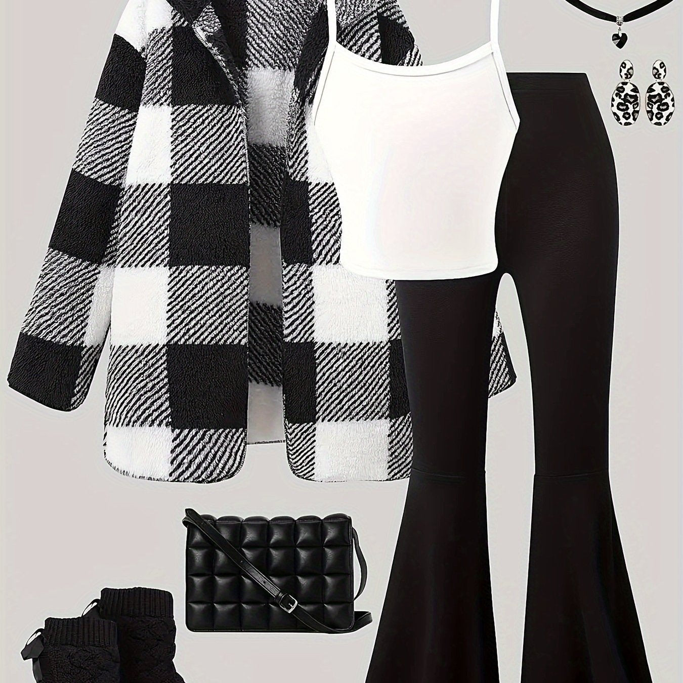 Three-Piece Black and White Plaid Long Sleeve Jacket with White Camisole Top and Black Flared Pants Set for Young Girls, Autumn-Winter Fashion Casual Outfit Suitable for Outdoor Leisure Activities (Excludes Bags and Shoes), P
